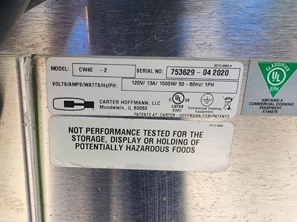 This used Carter Hoffmann CW4E 40-gallon chip warmer is in good cosmetic and working condition.