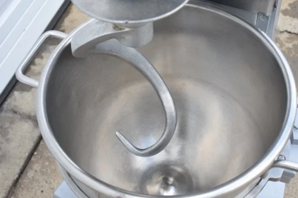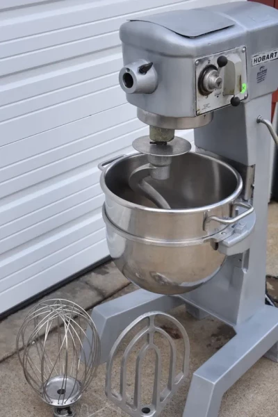 This Hobart D300 mixer is a heavy-duty commercial food mixer designed for high-volume use in bakeries, restaurants, and institutional kitchens. It included a stainless-steel bowl and three attachments as shown.