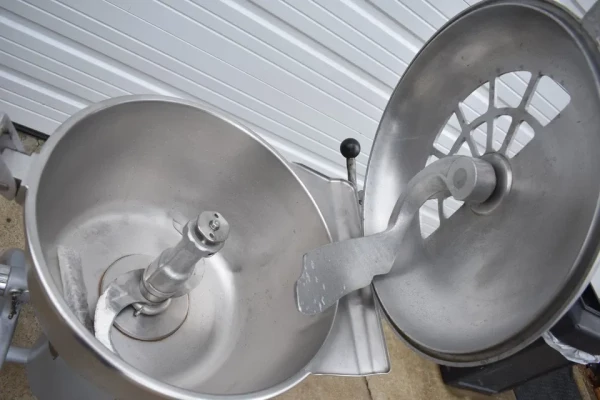 The Hobart VCM-40 vertical cutter mixer is a heavy-duty commercial food processor designed for high-volume use in bakeries, restaurants, and institutional kitchens. It features a large stainless-steel bowl with a tilting design, a fitted lid with locking handle, and a sturdy cast metal base.