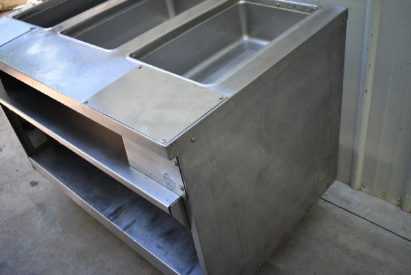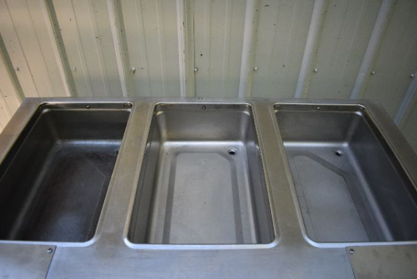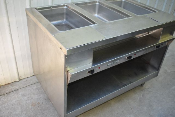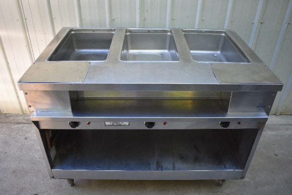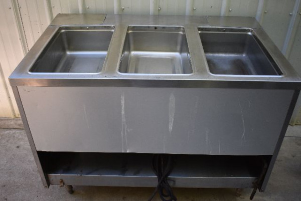 Iindividual die-stamped (3) 12" x 20" top openings, sealed well with bottom element (used for wet operation), individual thermostatically controlled, stationary modular, open shelf base, stainless steel top & ends.