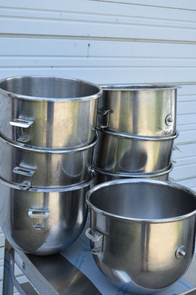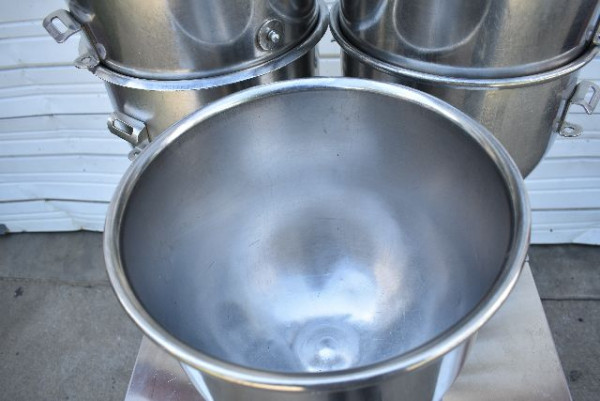 These used stainless steel Hobart A-200-20 bowls are all in very good cosmetic condition with very minor dings.