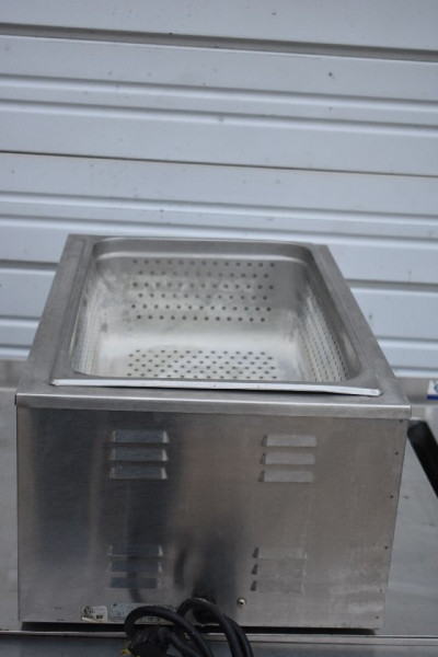 To ensure pan contents are heated thoroughly and evenly without hot or cold spots, the Antunes CW-100 countertop food warmer uses water and a tubular heating element. Its adjustable thermostat has a range of 120-212 degrees Fahrenheit, and indicator lights show low, medium, and high settings. Easing cleanup, there is a drain system in the front of the unit.