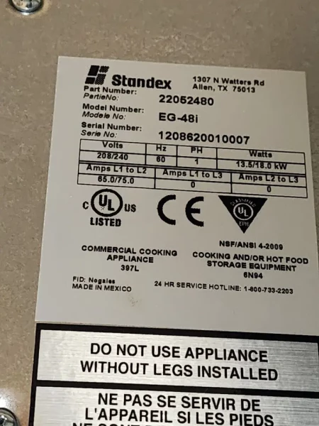 The EG-48i countertop griddle is an electric unit that is available as 208 Volts and 65 Amps for 13,500 Watts or 240 Volts and 75 Amps for 18,000 Watts and the unit has a terminal block on the right side.