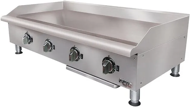 This countertop griddle has a stainless steel front and top skirt, aluminized steel sides and back, and it stands firmly on 4" adjustable legs. There is a 3" stainless steel backsplash, a sloped stainless steel side splash, and a 4 gallon grease collection drawer on this electric countertop griddle.