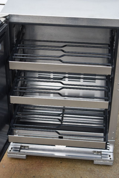Shallow-Depth Series Wine Reserve Refrigerator, undercounter, self-contained refrigeration, 40 - 68 degrees F temperature range. (3.1) cu. ft. (3) black vinyl-coated adjustable full extension wine shelves, stainless steel top, sides and interiors.
