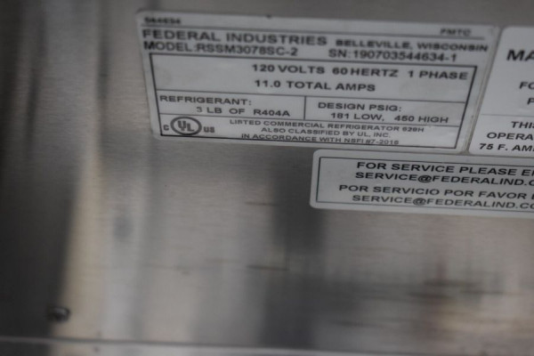 This used Federal Industries RSSM3078SC-2 self-service refrigerated air merchandisers is in very good cosmetic and working condition with minor scratches and dents.