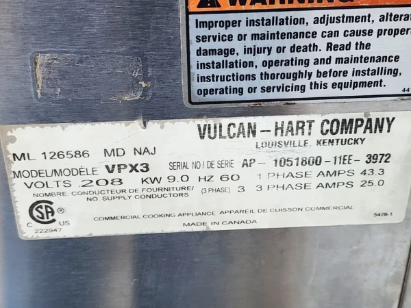 These used Vulcan VPX3 3pan electric steamer are in good cosmetic and working condition with minor scratches and dents.