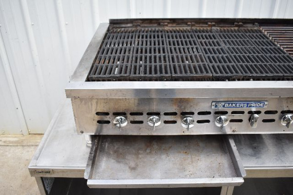 Made of stainless steel, the Bakers Pride XX-8 gas charbroiler includes a slide-out grease drawer for emptying waste. The 4-inch legs on this unit are made of chrome, and because of its low profile, this unit is intended for placement on a countertop.
